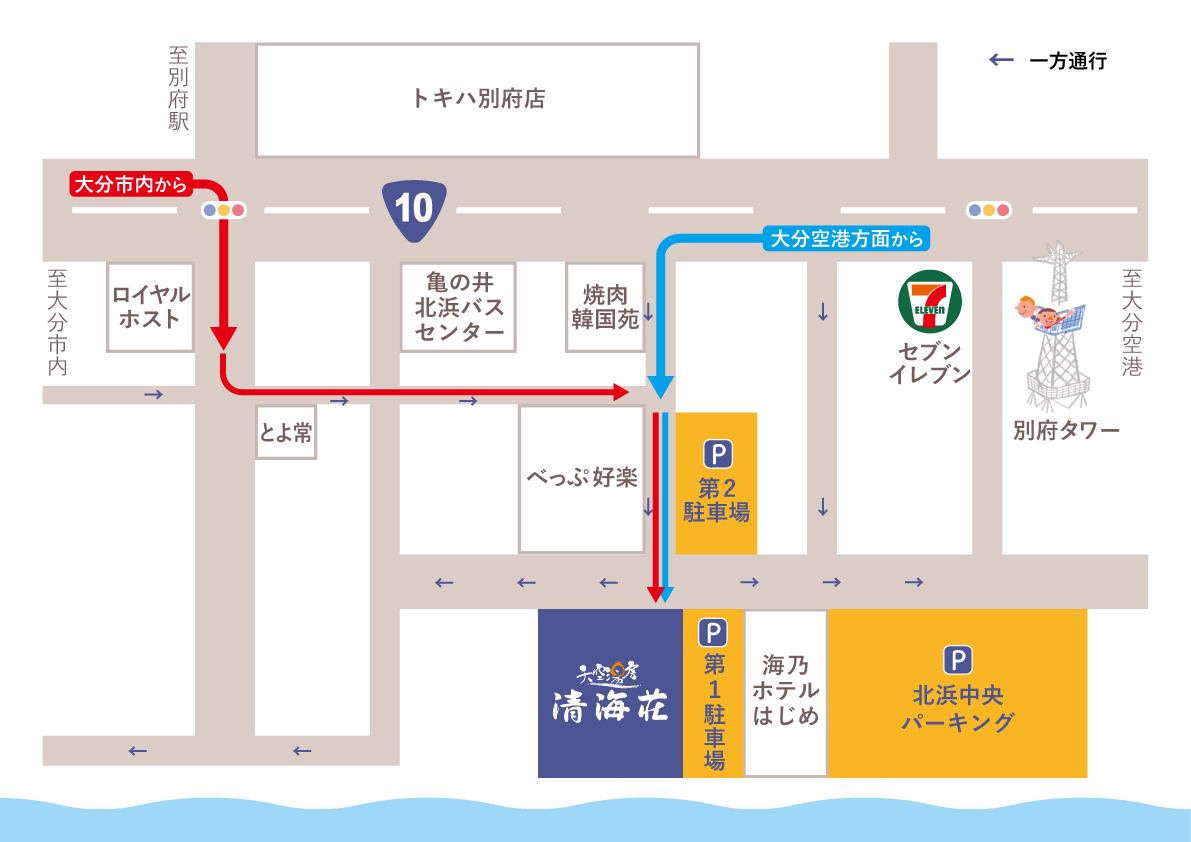汽車· 別府IC約15分鐘飛機· 大分機場 - 乘坐巴士約40分鐘(從北濱巴士站巴士步行2分鐘),JR· 別府站 - 步行約10分鐘